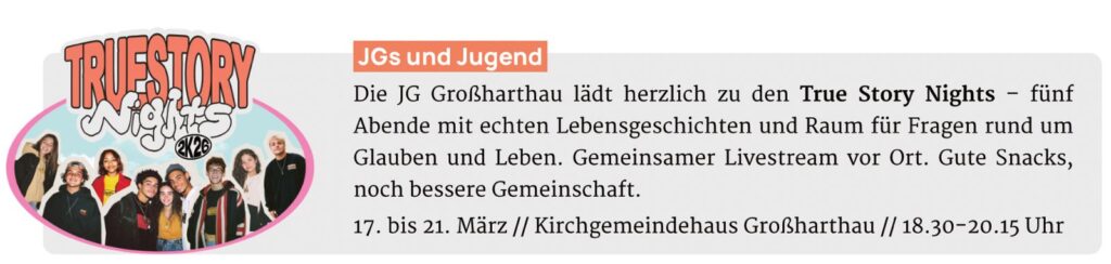 - True Story Nights vom 17. bis 21. März im Kirchgemeindehaus Großharthau jeweils von 18:30 bis 20:15 Uhr